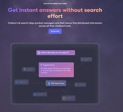 Collato is an AI search engine designed to help product teams quickly find distributed product information and save time by eliminating information silos. It connects all relevant links and files, provides instant, bite-sized answers with auto-generated summaries, and is secure and GDPR compliant.