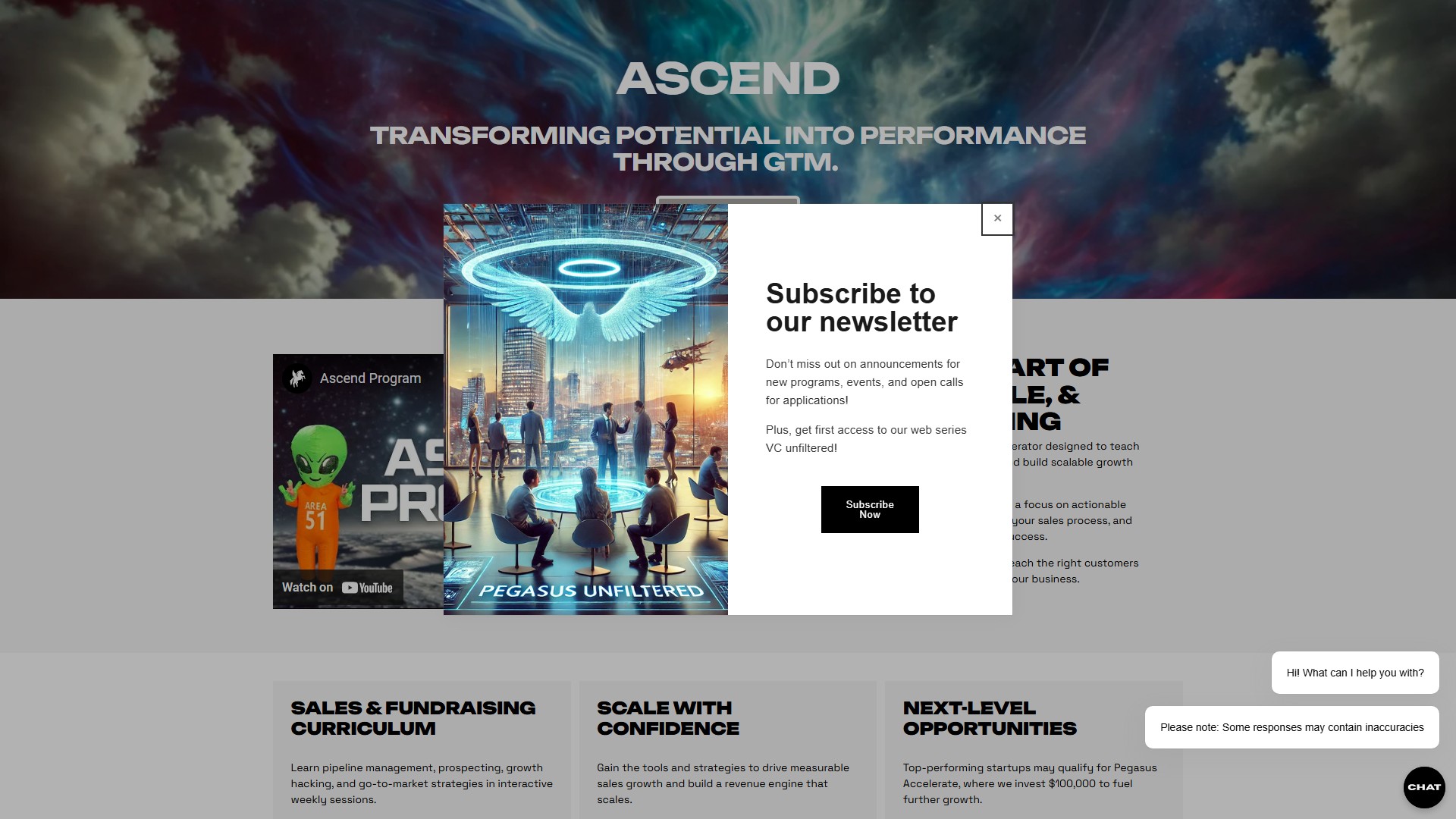 Program Overview Pegasus Ascend is an accelerator focused on sales mastery and scaling. It operates on an advisor equity model, taking 0.5-2% equity without upfront cash investment.
