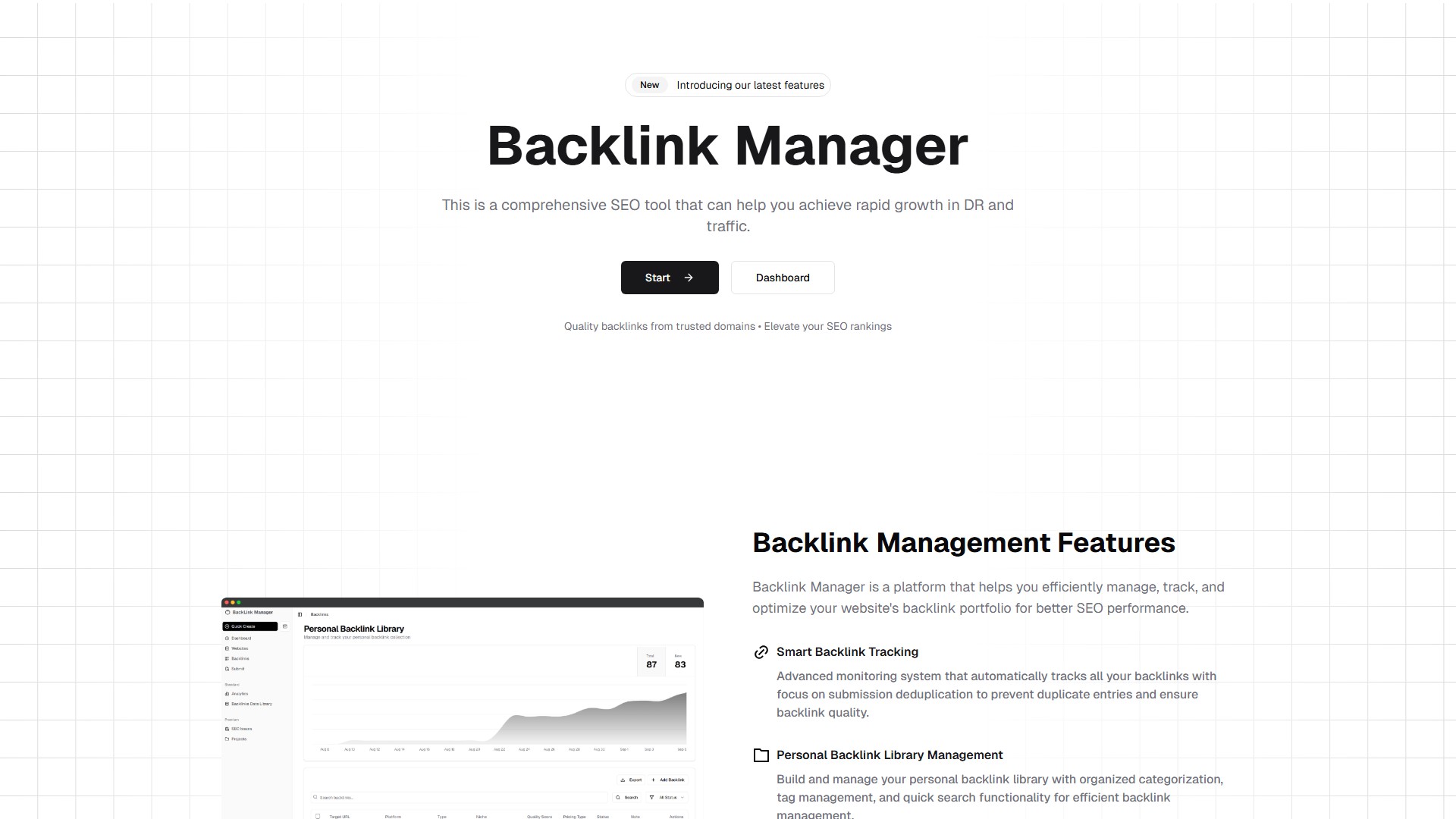• Dashboard access, website management, backlink tracking, submit functionality, backlink submission deduplication, personal backlinks library management