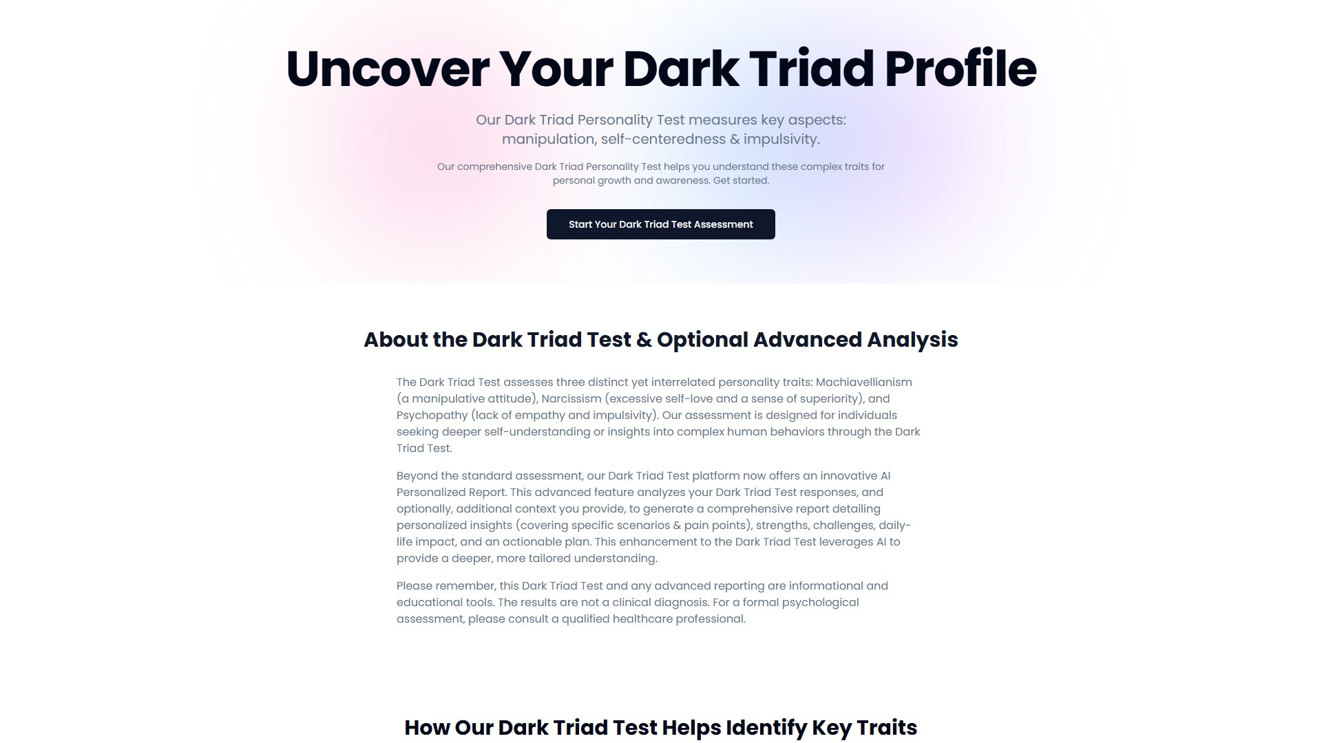 The core Dark Triad Personality Test is free. The AI Personalized Report is an optional premium feature, indicating a freemium model. Exact pricing is not specified.
