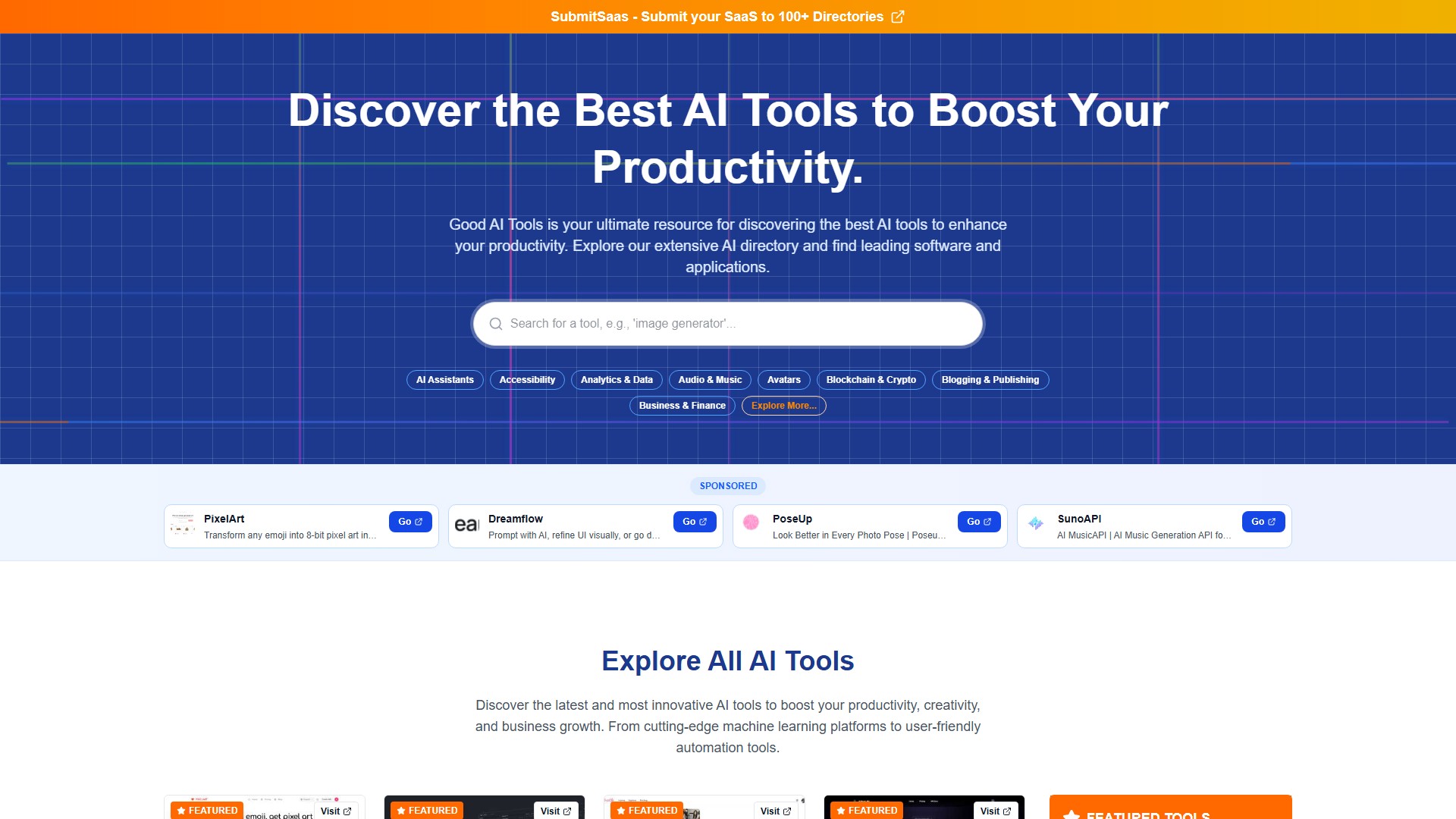 Good AI Tools is a comprehensive directory website for AI tools, designed to help users discover the latest and most innovative AI applications. The website enhances user efficiency, creativity, and business growth through: