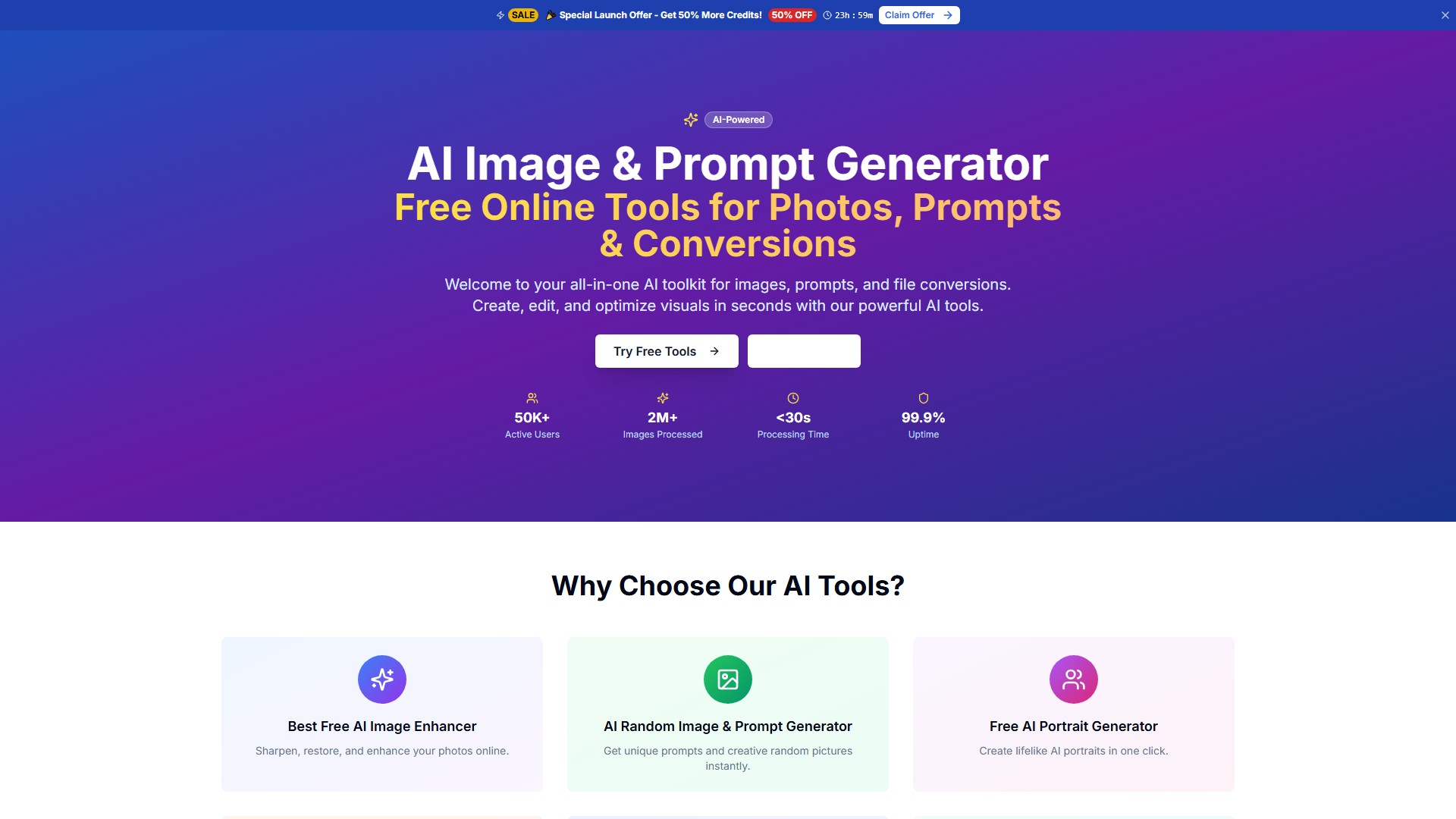 Operates on a freemium model. A variety of free tools are available for daily use, while advanced features require purchasing credits. A special launch offer is currently available, giving users 50% more credits on purchase.
