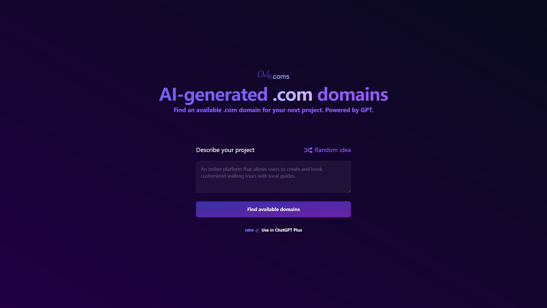 Only.Coms tool helps users find available .com domains for their projects. Users can describe their project and the tool will generate a list of potential domain names. The tool also allows users to request more results or start over.