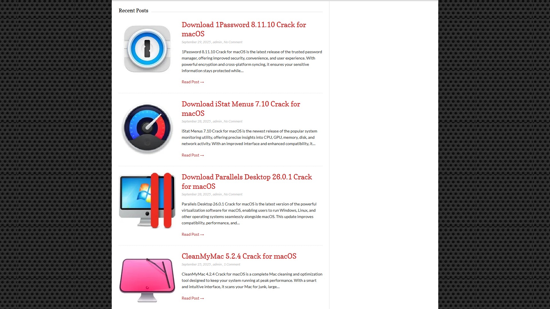 Provides downloads for various macOS software, specifically cracked versions of commercial applications like 1Password, Parallels Desktop, CleanMyMac, and SketchUp Pro.