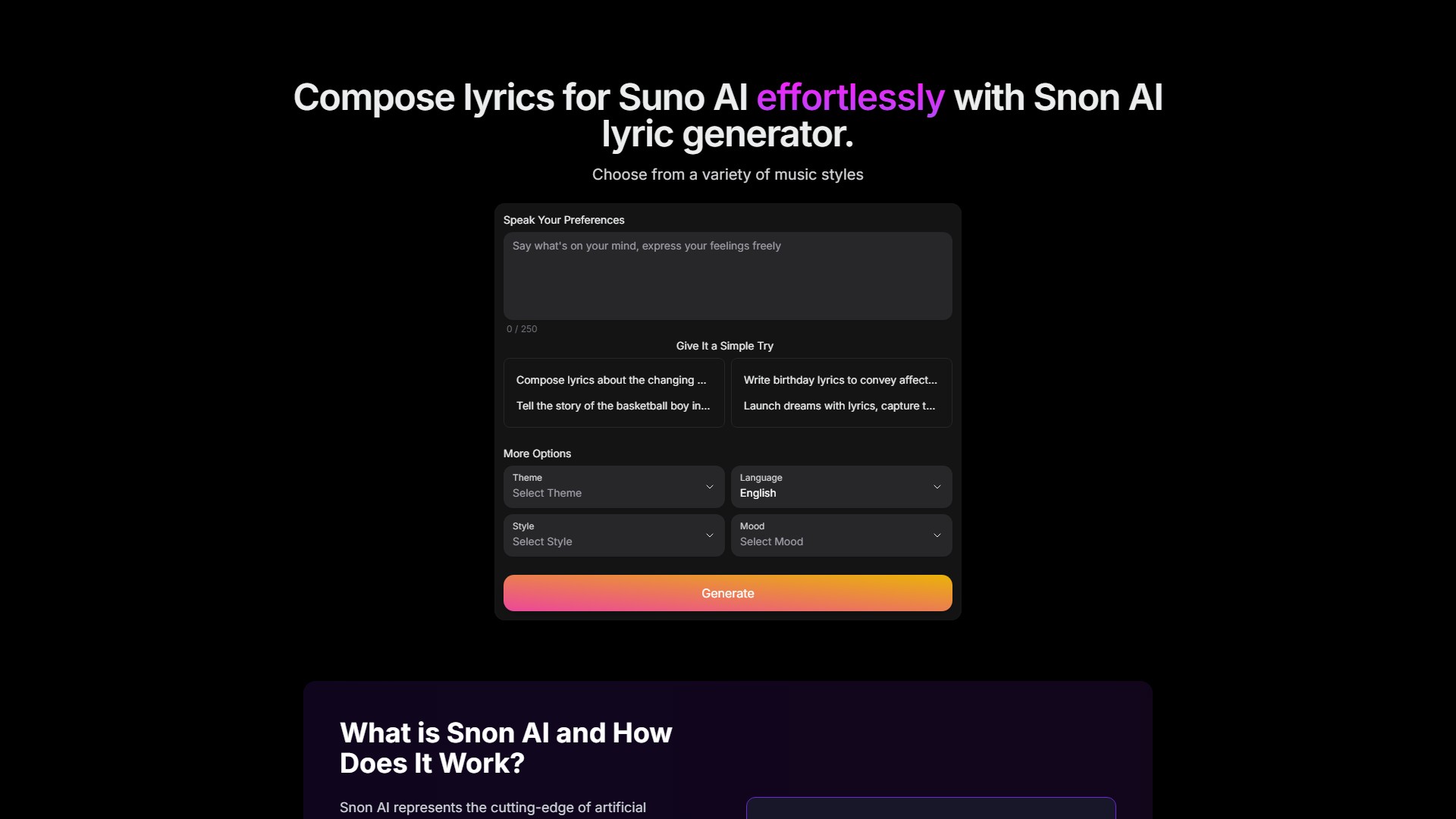 - AI-Powered Generation: Utilizes Snon AI technology to analyze user input and create lyrics that match the theme and emotion.
