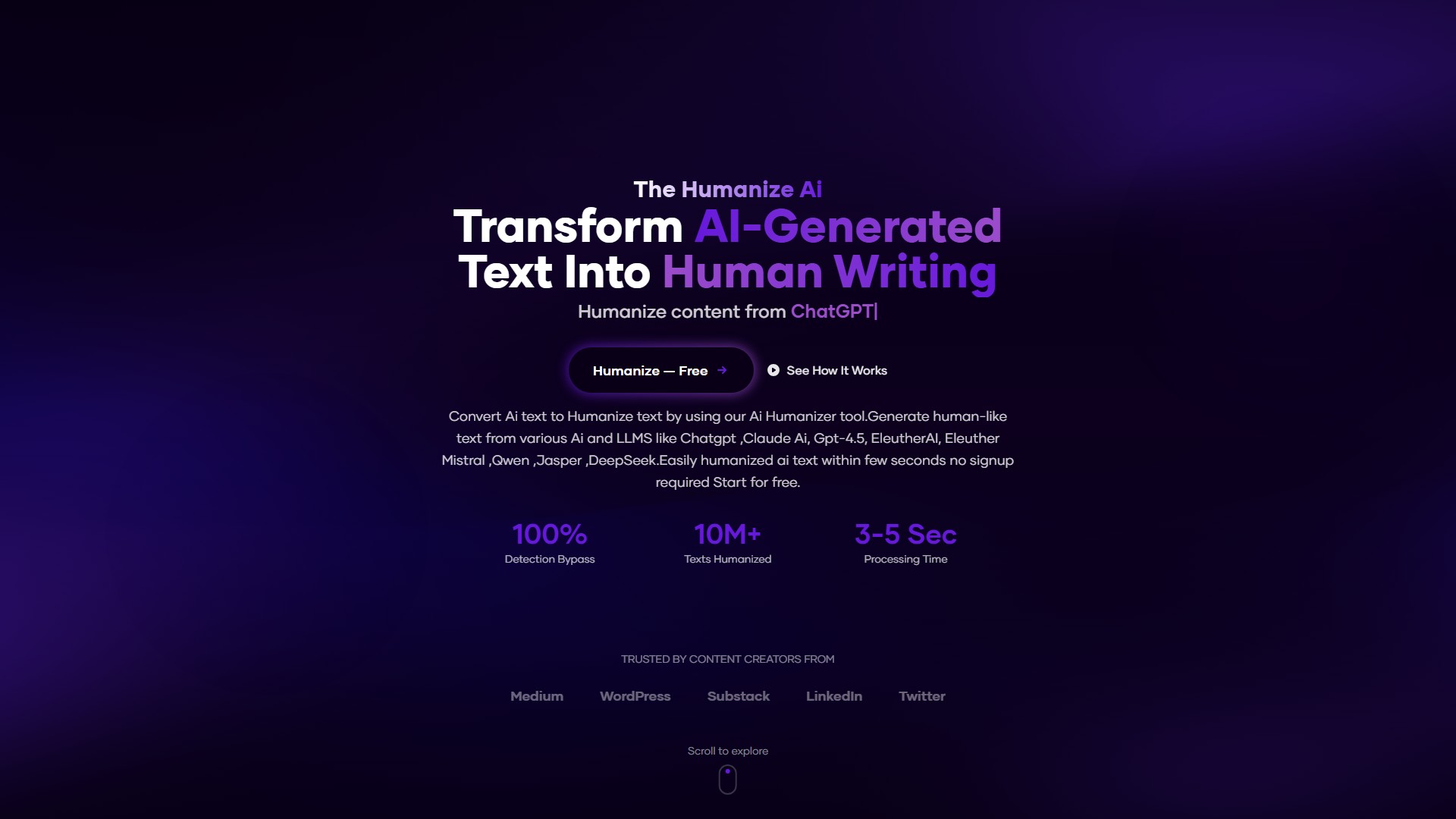- Text Humanization: Converts text generated by AI models like ChatGPT, Claude AI, GPT-4.5, Gemini, and DeepSeek into human-sounding content.