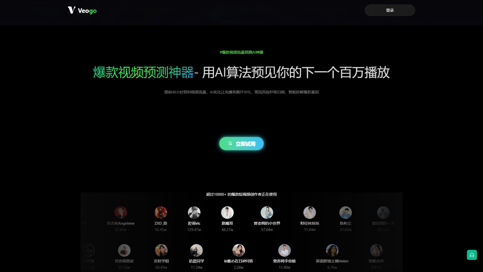 • What is VeoGo AI?: An intelligent prediction tool for short video creators that uses deep learning algorithms to predict video traffic performance in advance and provides second-level optimization suggestions.