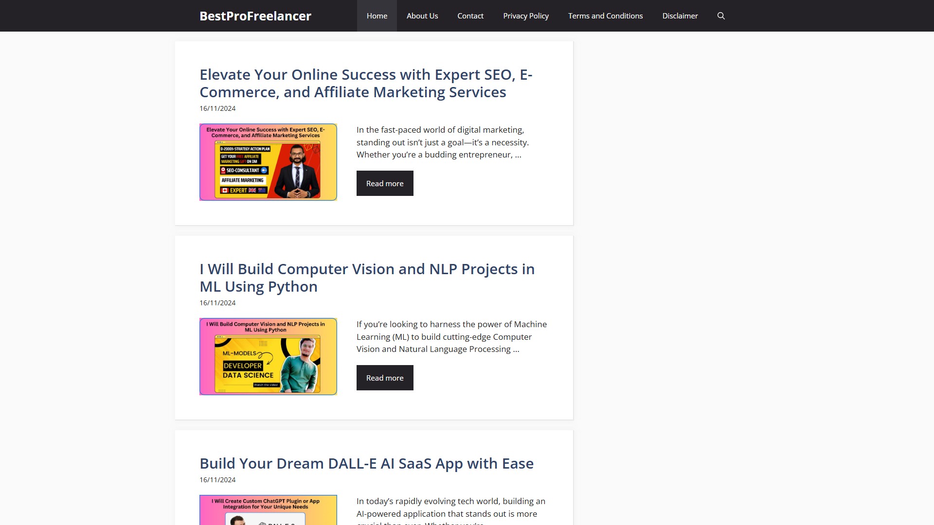 Users select services from the website list (via "Read more" links), submit project details, and freelancers provide customized solutions. Target users include entrepreneurs, online business owners, content creators, and medical institutions. Core advantages are improved online visibility, automated operations, and cost reduction. Typical use cases:
