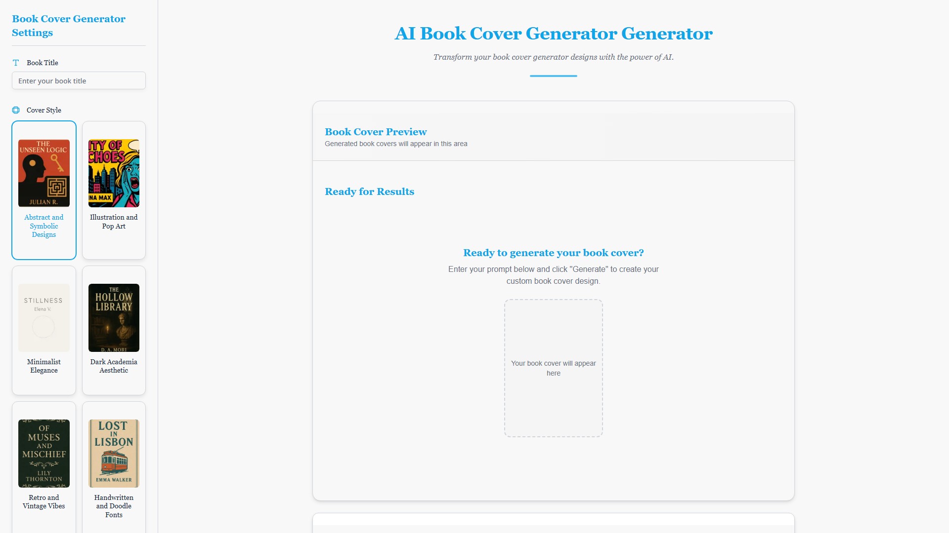 Generates multiple book cover design options in seconds by entering the book title and a descriptive prompt.