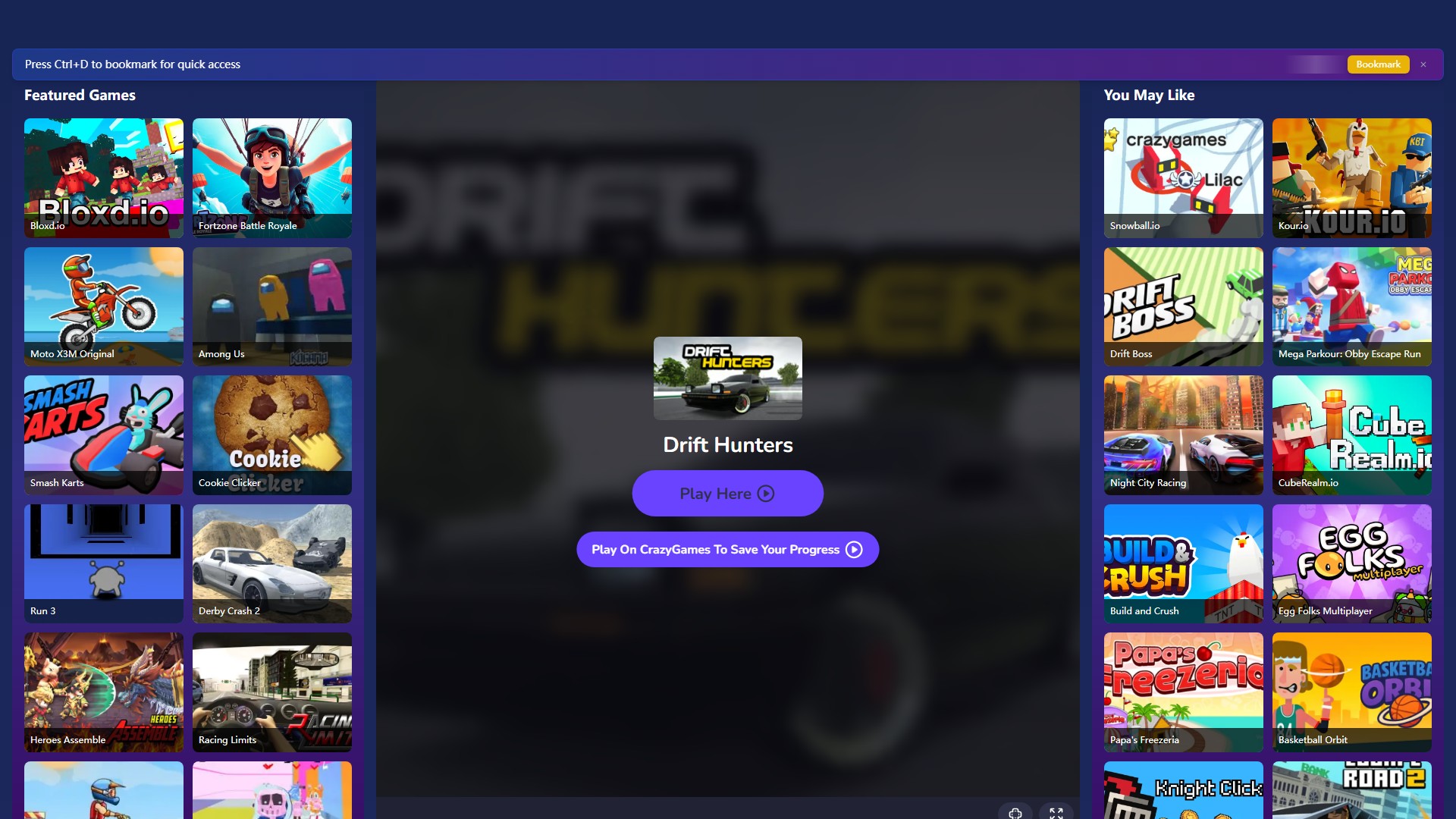 - Game library features popular titles like Bloxd.io, Among Us, Cookie Clicker, Moto X3M, and more