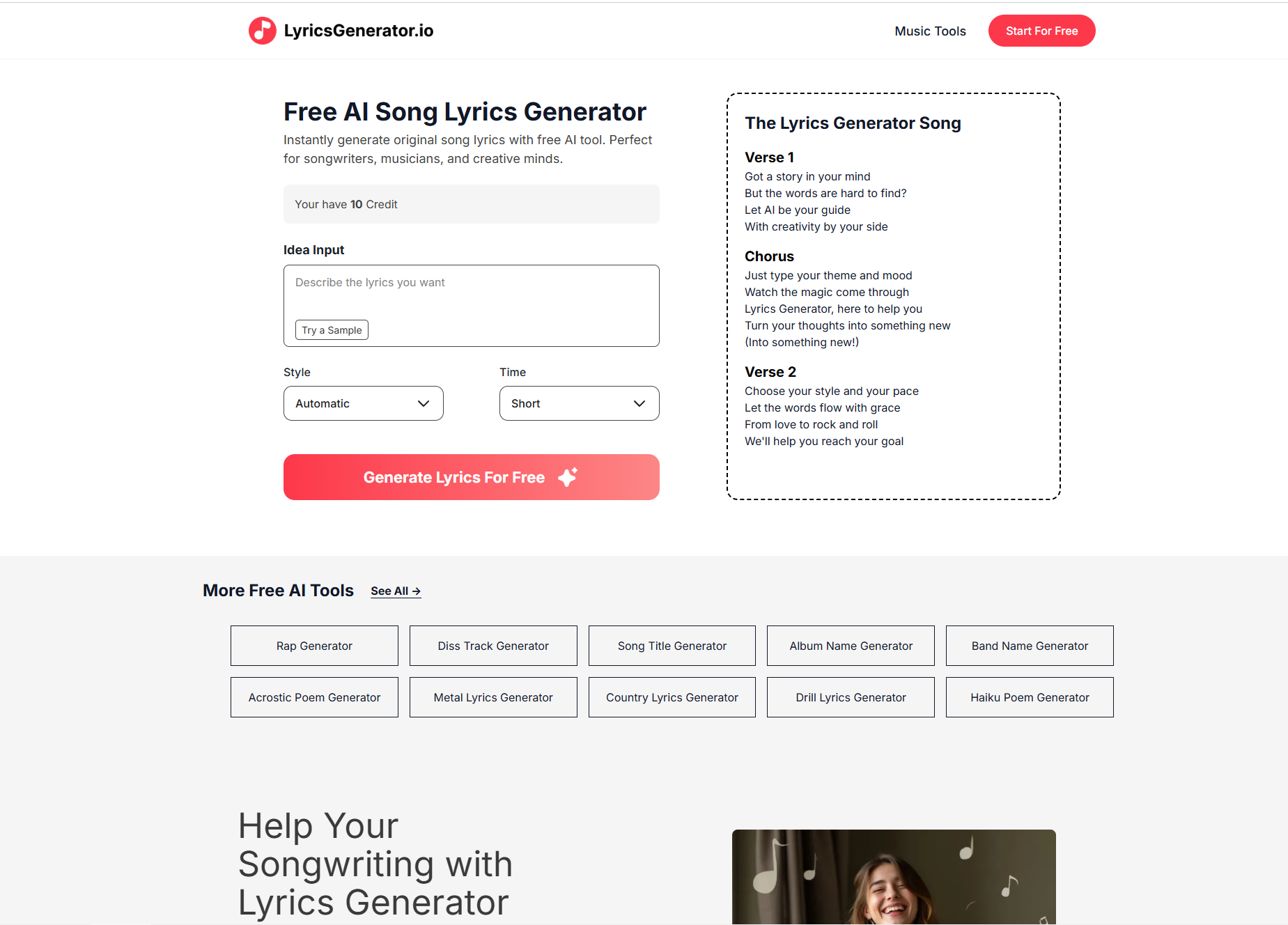 Main features: instantly generate original song lyrics with customizable themes, emotions, and keywords. Supports multiple music styles (rock, country, metal, etc.) and rhythms (short/medium/long). Provides smart rhyme and rhythm suggestions. Target users: singers, musicians, songwriters, music producers, sound engineers, and creative professionals. Core advantages: free usage (10 daily generations), fast high-quality output, personalized customization, multi-language support (English optimized). Typical workflow: input theme → select style/rhythm → AI generates lyrics → manual editing.