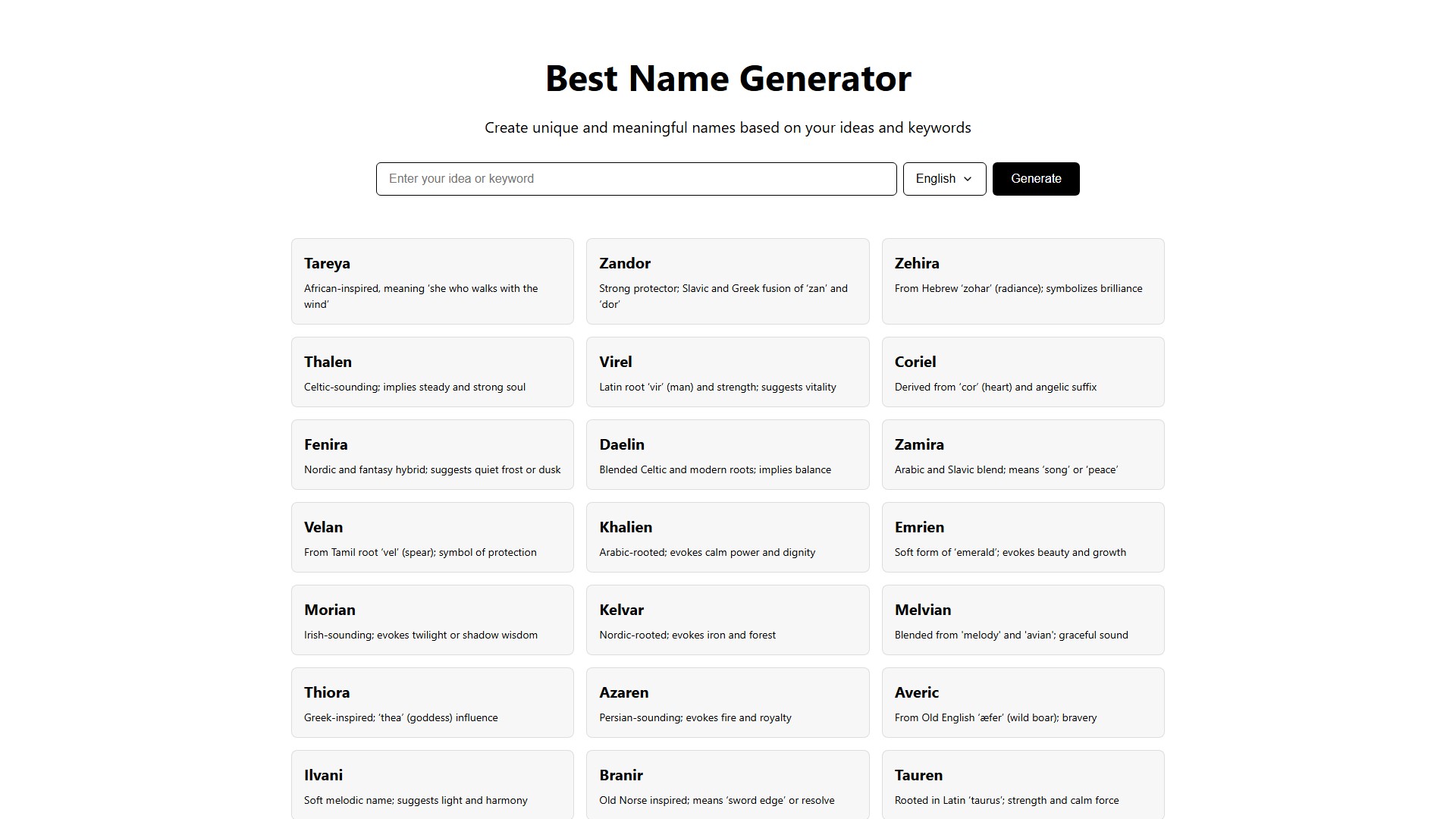 AI-Powered Generation: Uses advanced AI algorithms to analyze linguistic patterns and context, generating unique and relevant names