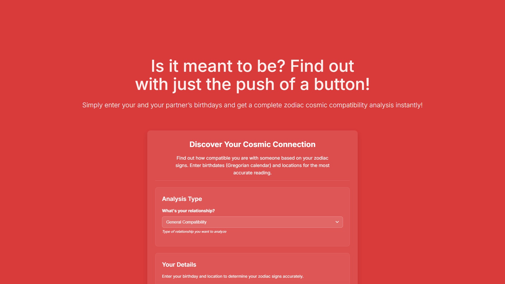 • Cosmic Compatibility Score: Get a love compatibility score reflecting your cosmic alignment with your partner, calculated using multiple astrological factors