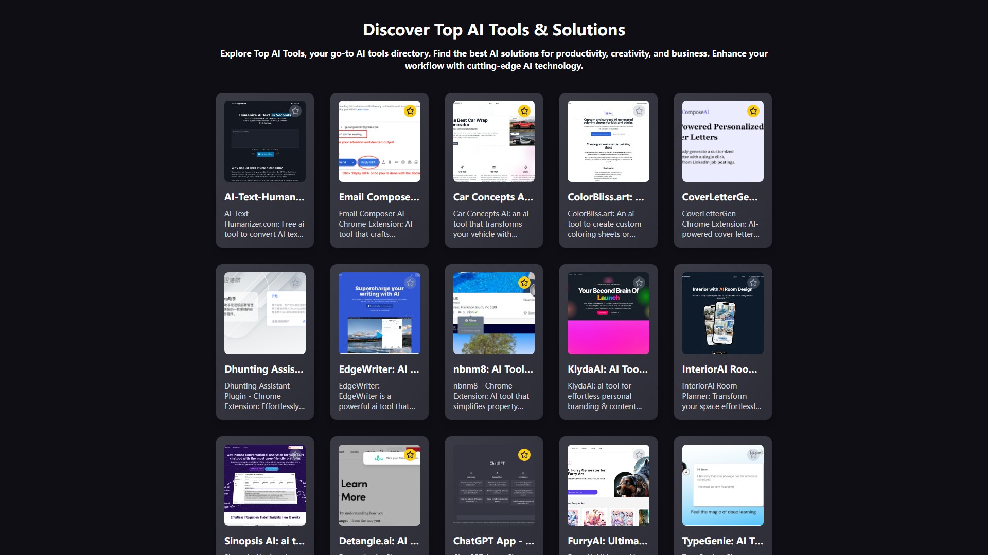 Main features: Provides AI tools directory and categorized browsing, including text-to-image, AI writing, AI ad generation, AI chatbots and other categories. Featured tools include AI text humanizer, email composer AI, car concepts design AI, custom coloring sheet generator, cover letter generator, resume processing plugin, etc. Target users: Individual users, enterprise users, developers, content creators, designers looking for AI tools. Core advantages: Rich variety of tools, clear categorization, covering multiple application scenarios, providing detailed tool descriptions and links. Usage flow: Users can find suitable AI tools through category browsing or search, click to view details and visit tool websites. Pricing models: Directory service is free, listed tools have various models including free, freemium, paid, etc.