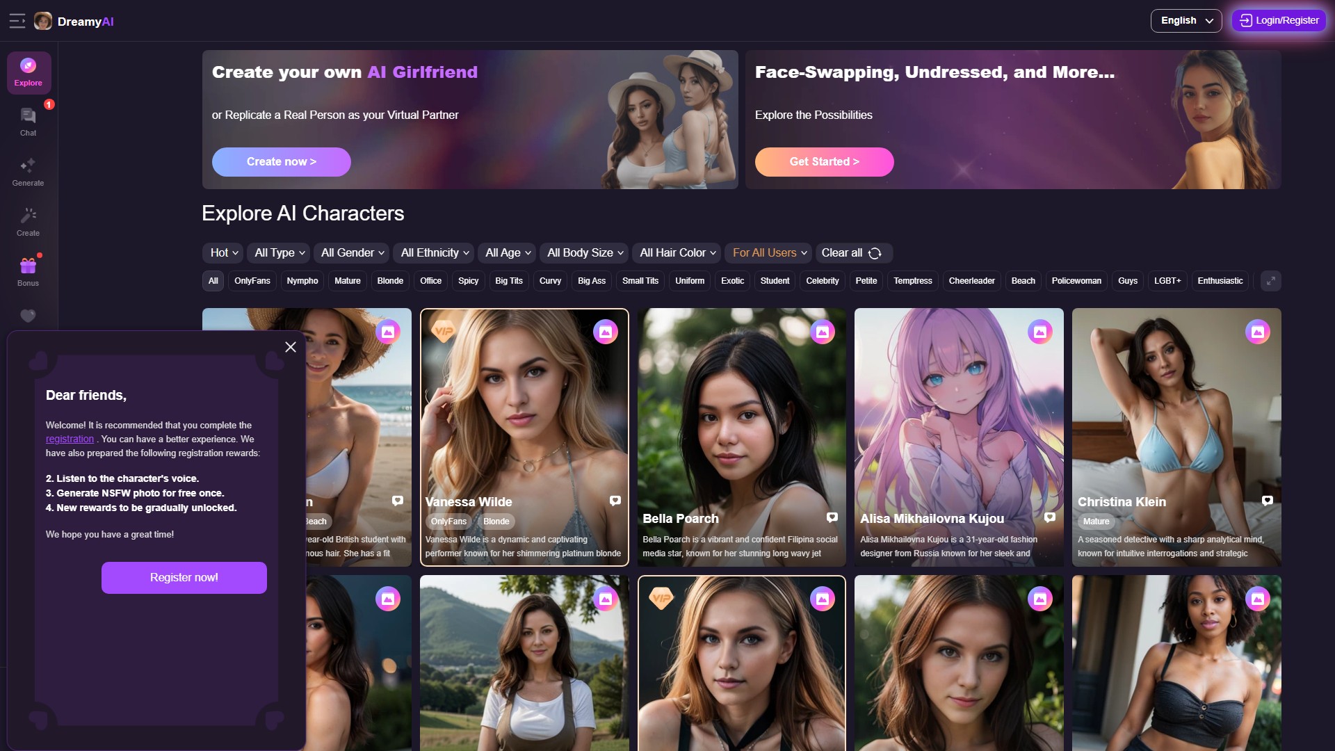 Various character types available: OnlyFans, Nympho, Mature, Blonde, Office, Spicy, Big Tits, Curvy, Celebrity, etc. to satisfy different preferences