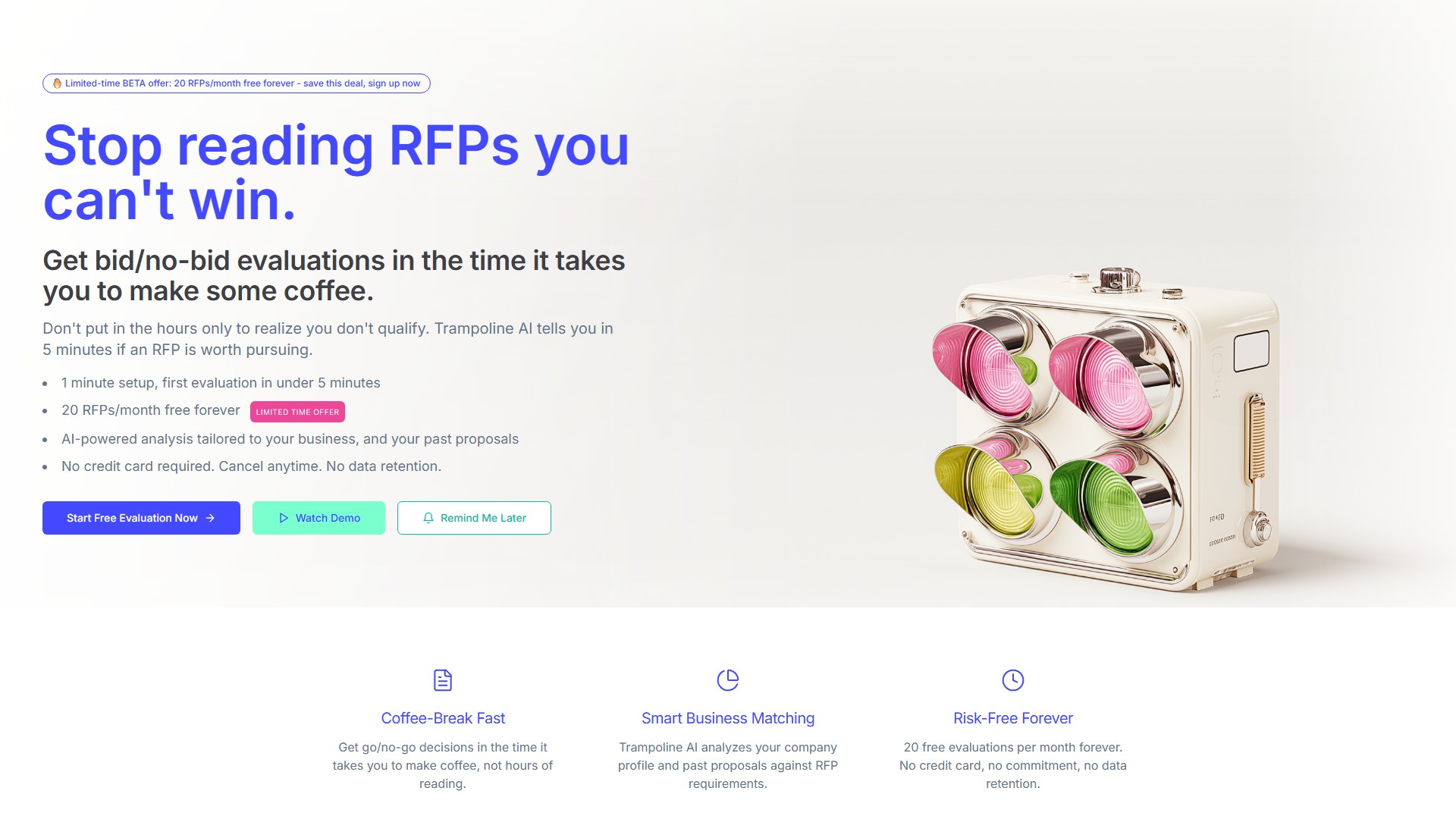Trampoline AI provides intelligent bid/no-bid decision evaluations, quickly determining RFP match and win probability by analyzing company profiles and past proposals.