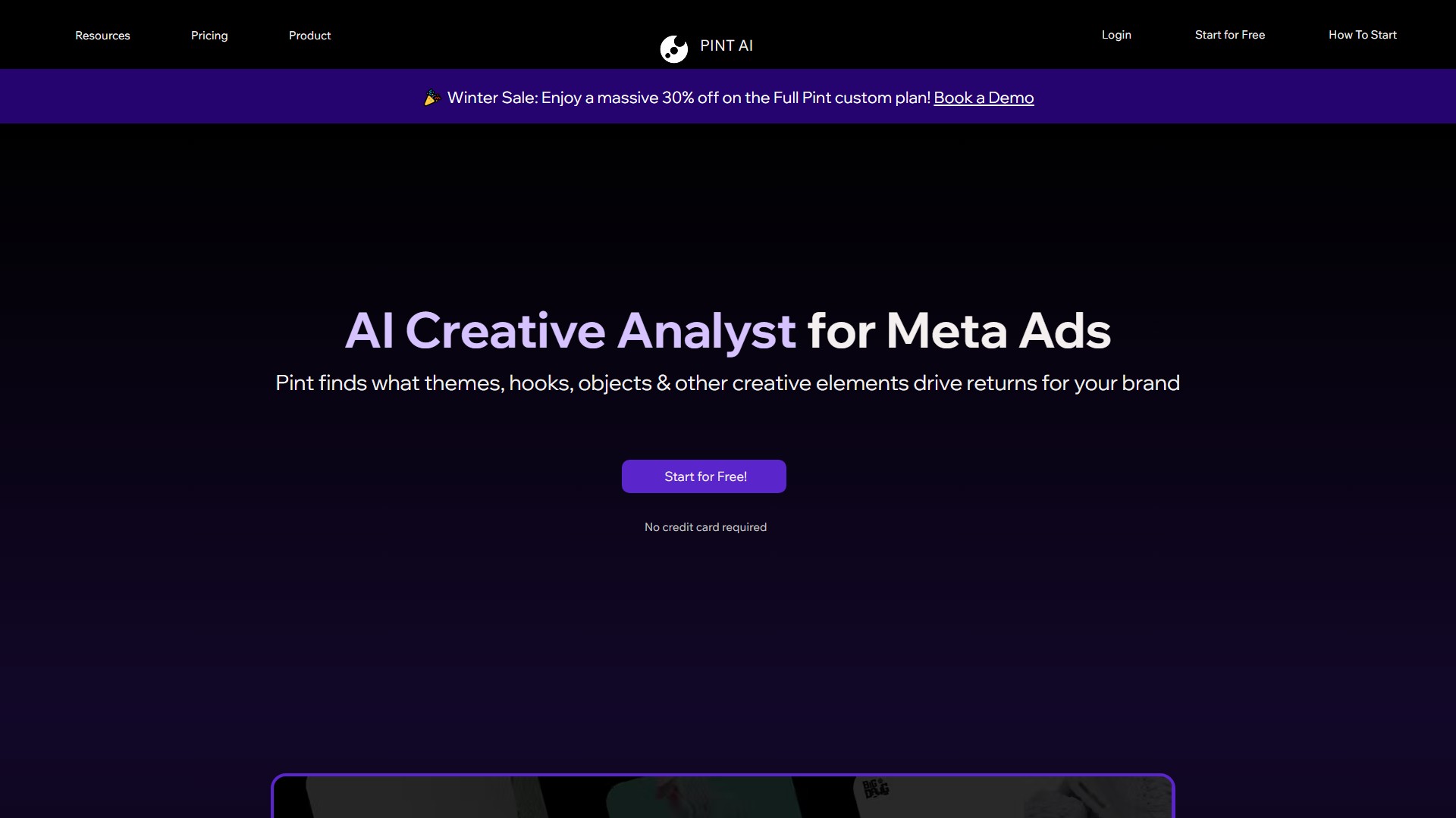 • Automatic Element Tagging: No more manual tagging. Pint AI automatically extracts and tags over 5,000 creative elements, including People, Messaging, Themes, Hooks, Objects, and Audio.