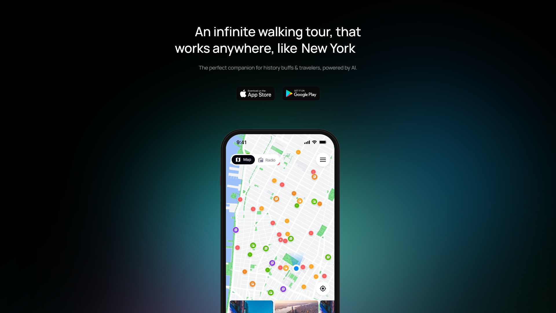 Provides infinite AI-powered audio story tours based on the user's location. Users can listen to stories anywhere they are traveling, including cities, villages, towns, and hiking trails.