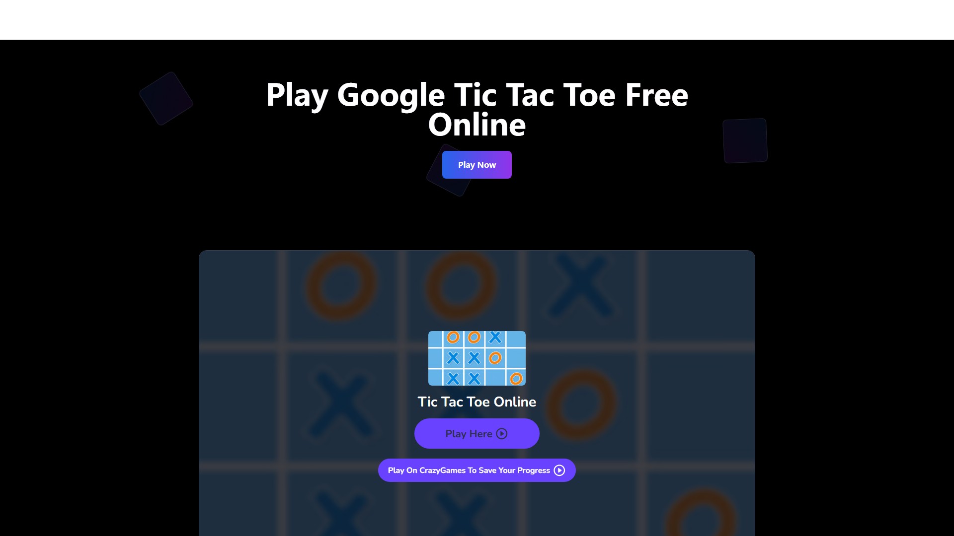 How to start: Simply click the "Play Now" button on the website, and you'll be playing Tic Tac Toe within seconds. The game runs directly in your browser, no downloads required.