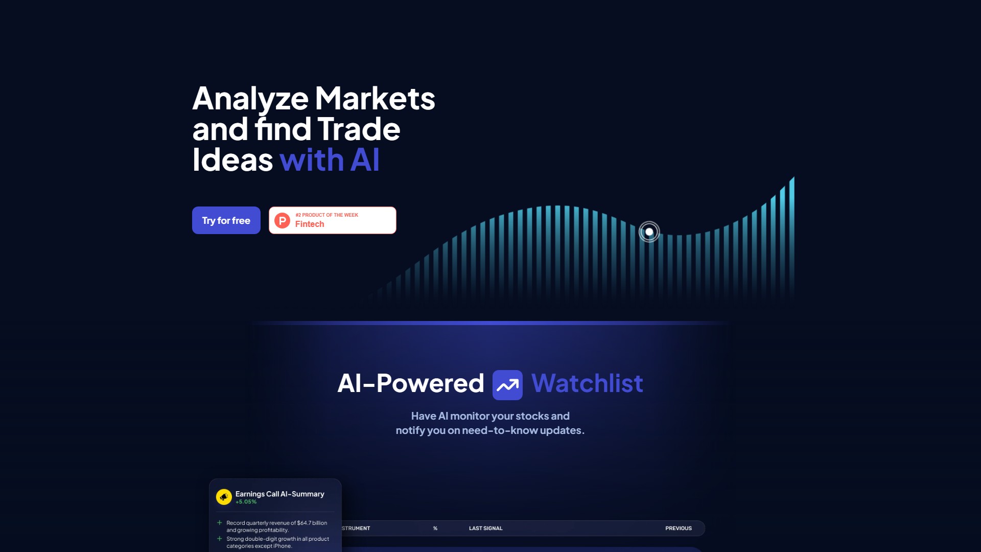 • Offers a free trial. The website indicates "Try for free" and "Create Watchlist for Free," suggesting a freemium model, but specific pricing for paid tiers is not detailed on the page.