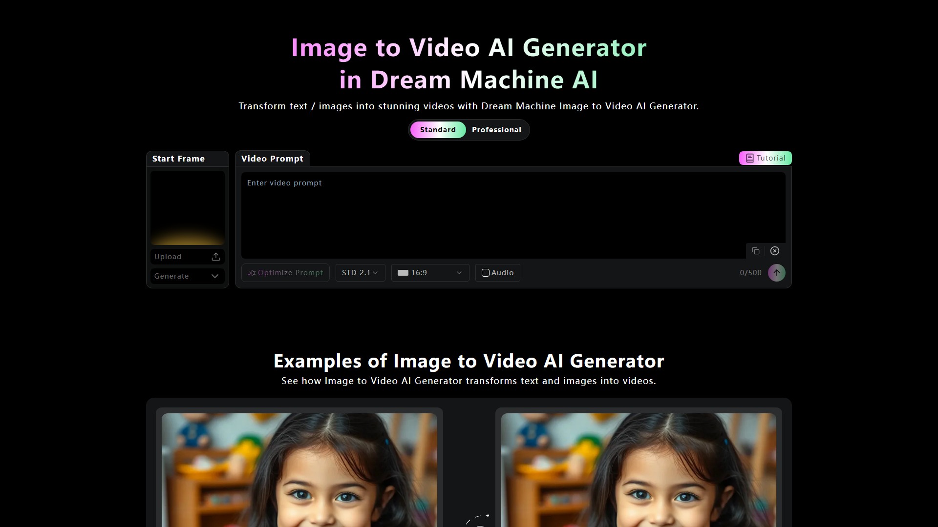 The Dream Machine AI Image to Video Generator allows users to upload a start frame image and optionally input a video prompt to guide the generation. Users can select from different model versions (e.g., STD 2.1, Ray2, VEO 3 Fast) and video resolutions (e.g., 16:9, 9:16). The process is simple: upload an image, optimize the prompt, choose the model and resolution, and then click generate.