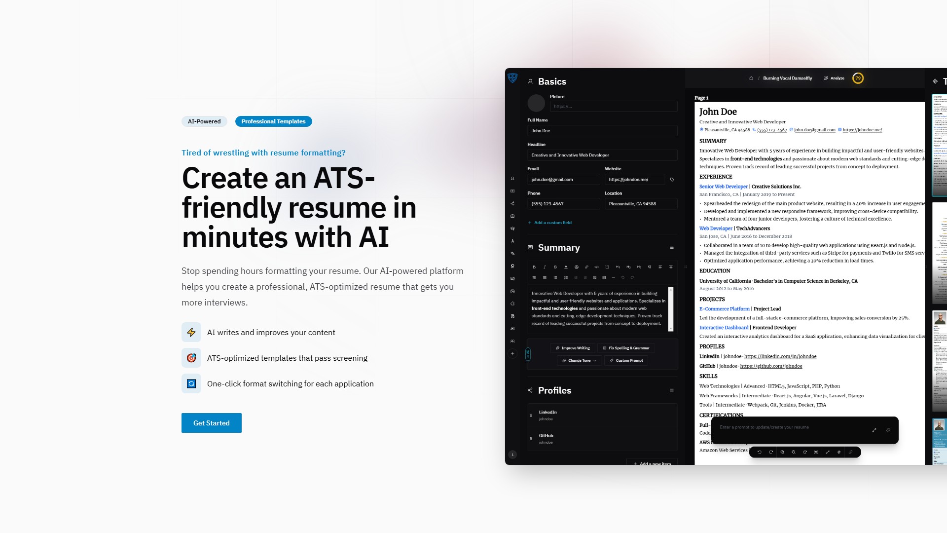 Users can create resumes through the AI-powered platform, using professional templates and leveraging AI writing and optimization features. It supports importing from LinkedIn and allows one-click format switching for different job applications.