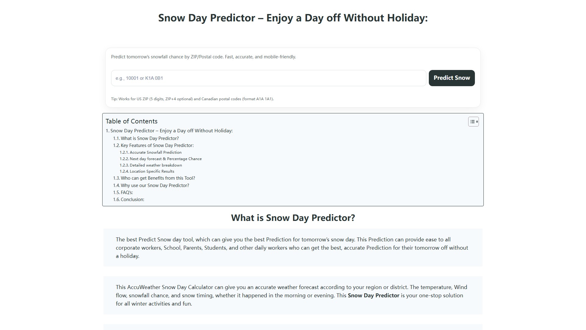 Predicts the chance of snowfall for the next day in a specific area by entering a US ZIP code or Canadian postal code.