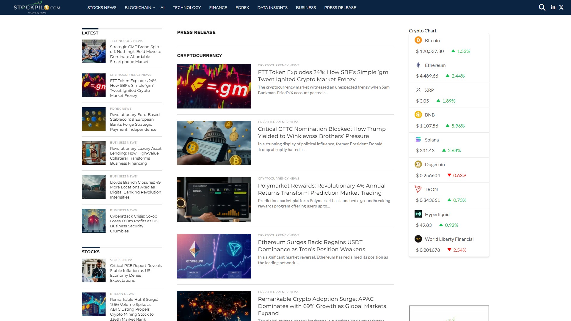 Covers multiple categories including stocks news, blockchain, cryptocurrency, artificial intelligence, technology, finance, forex, data insights, business news and press releases