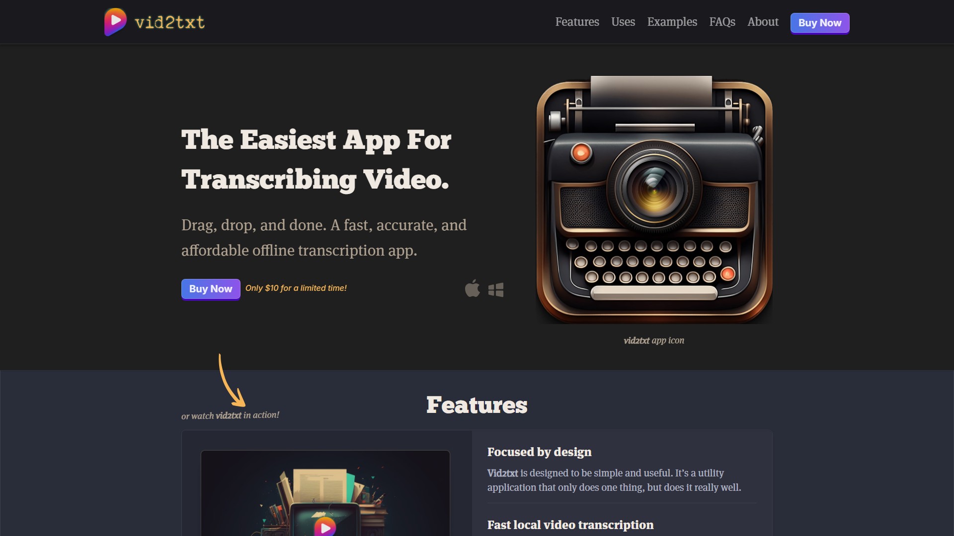Vid2txt is an offline transcription app for MacOS and Windows that quickly and accurately generates .txt, .srt, and .vtt files from video and audio files. It is designed to be simple and useful, and is pay-once, use-forever with no quotas or limits. Vid2txt is useful for content creators, journalists, students, business professionals, hearing impaired people, researchers, and more.