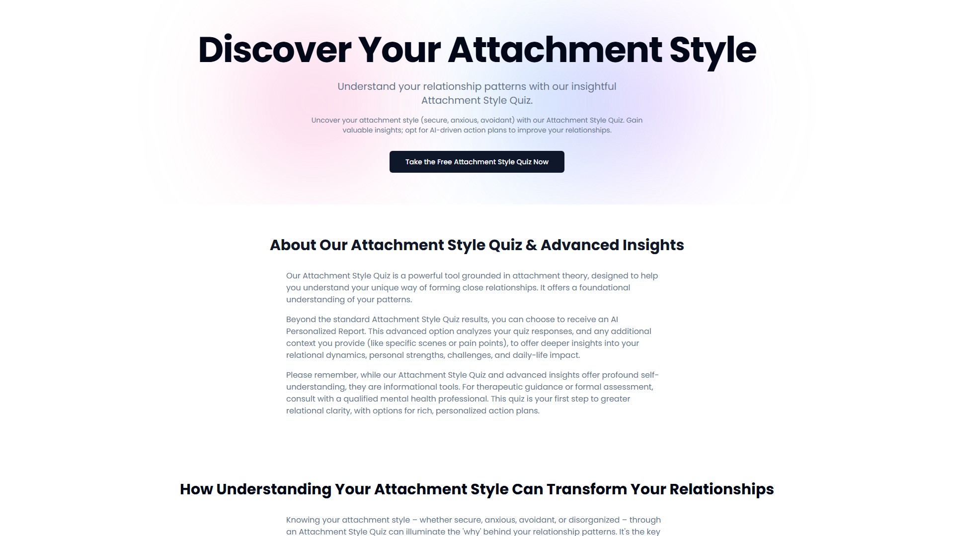 主要功能 提供一个免费的依恋风格测验,帮助用户识别自己是安全型、焦虑型、回避型还是紊乱型依恋风格。用户在完成基础测验后,可选择解锁AI个性化报告,以获得更深入的洞察。