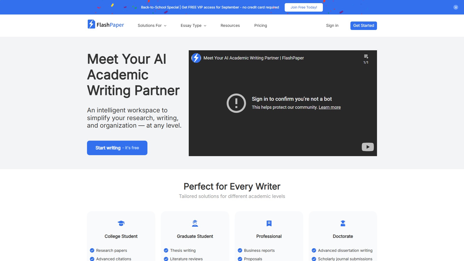 FlashPaper是AI学术写作平台,提供从研究到写作、引用和格式化的一体化解决方案。核心功能包括:AI写作助手(Ask AI)生成大纲和内容、自动引用生成器(支持APA/MLA/Chicago等格式)、文献数据库访问、抄袭检查、来源分析、学术格式化及Humanizer功能(使AI写作更自然)。针对不同用户群体提供定制方案:大学生(研究论文/高级引用)、研究生(论文写作/文献综述)、专业人士(商业报告/提案)、博士生(高级论文写作/期刊投稿)、高中生(基础写作/语法帮助)、研究员(论文起草/同行评审)、教育工作者(课程材料/评估反馈)及终身学习者(个人项目/知识总结)。优势在于整合工作流程、提高效率、保持学术专业性,并提供免费计划(含核心功能)和付费计划(解锁高级引用格式如AMA/ACS)。