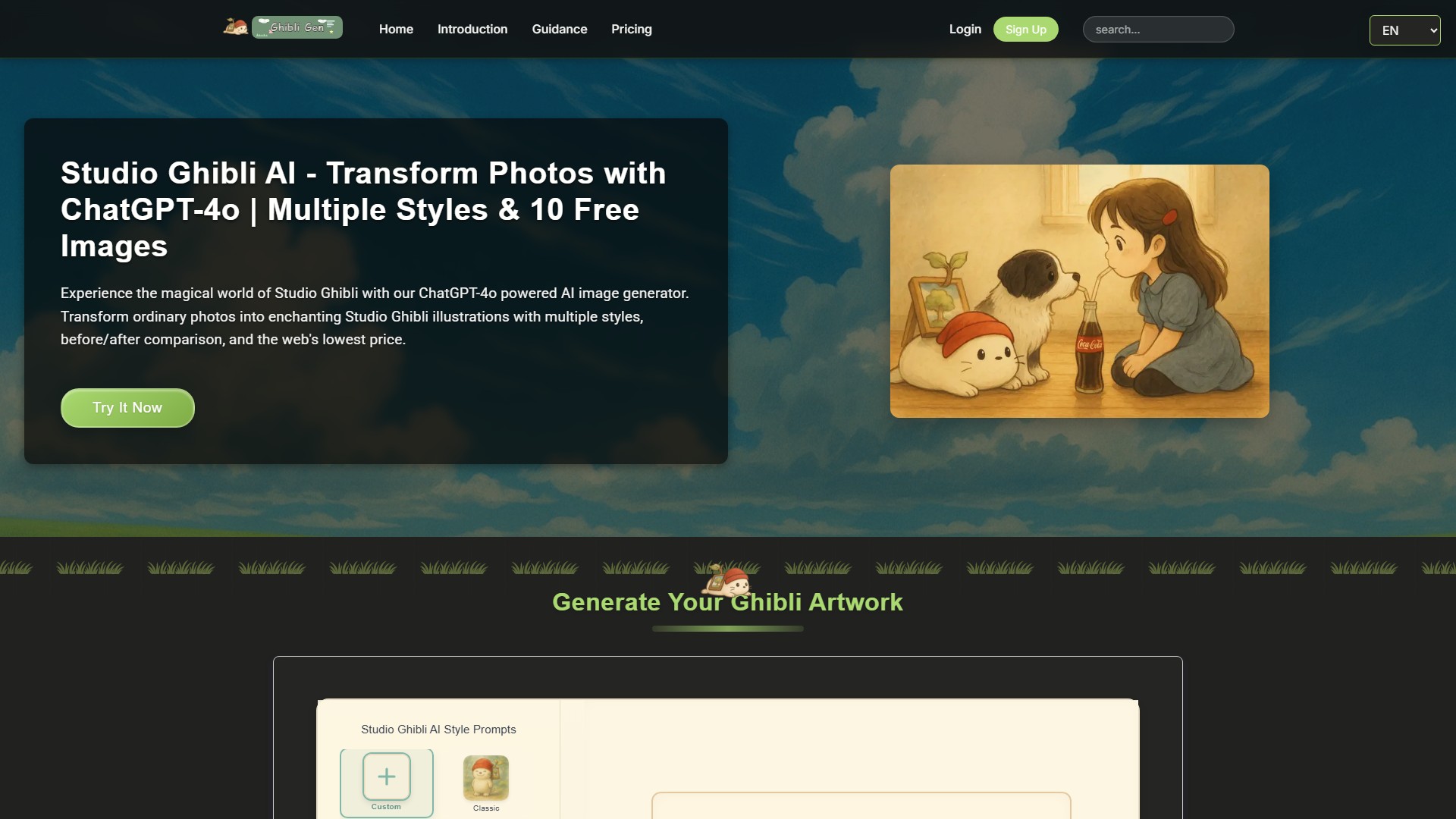 这是一个由 ChatGPT-4o 驱动的先进工具,可将照片转换为吉卜力工作室独特的手绘美学风格。支持多图像生成、前后对比和多种风格选择,并提供10张免费图片。