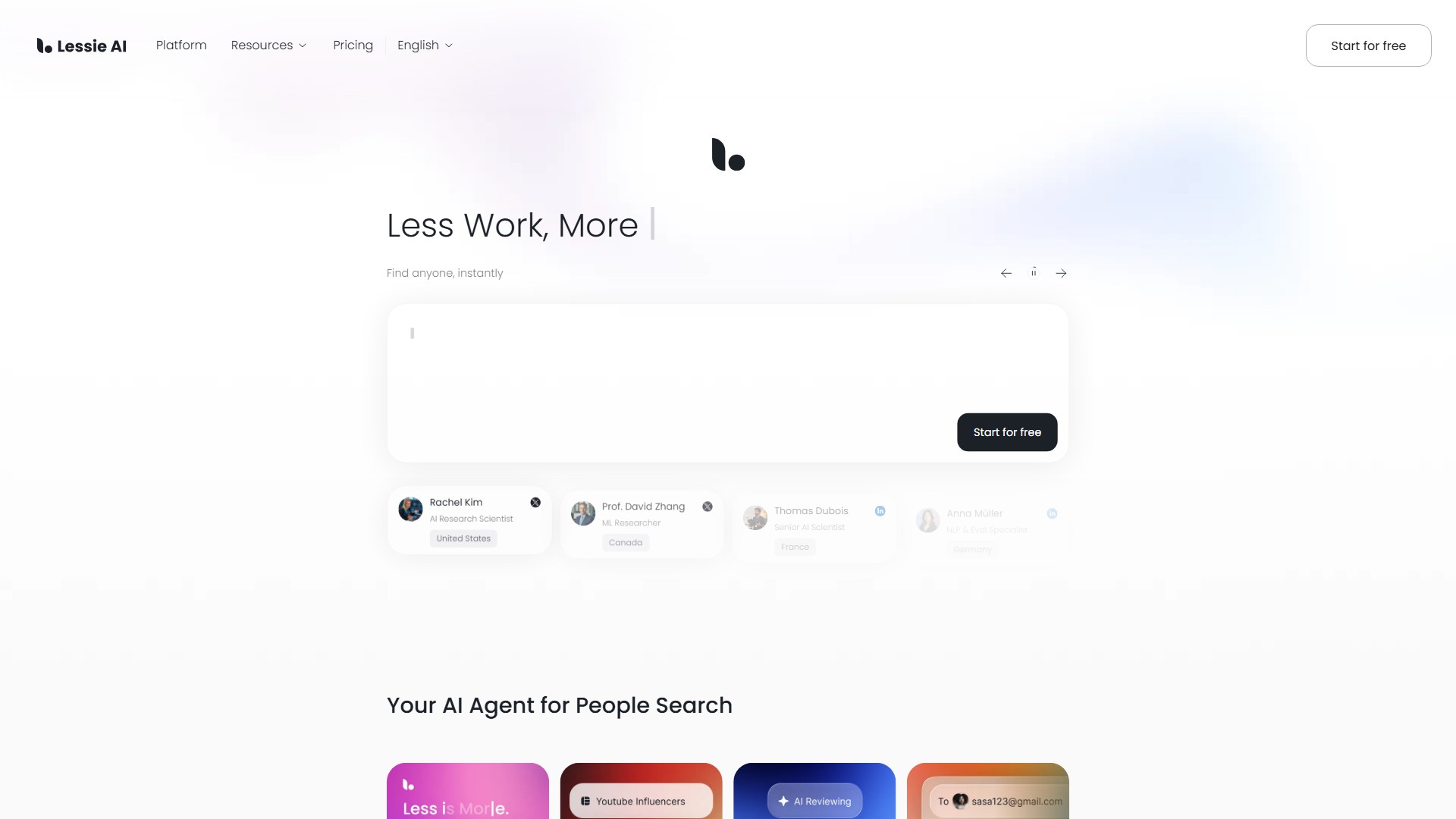 主要功能:Lessie AI是AI代理工具,专注于人员搜索和影响者营销。核心功能包括AI辅助的理想联系人画像构建(按行业、角色、规模等维度)、多源联系人发现(扫描公共数据、社交媒体、播客和数据库)、AI评分与高潜力线索优先级排序、自动化个性化外联(AI撰写定制消息并规模化触达)。适用场景:寻找高契合度影响者(TikTok/YouTube/Instagram等平台)、识别潜在客户(C级买家至营销线索)、定位技术专家(工程师/研究人员)、拓展合作伙伴(联盟/通讯运营商/记者)。目标用户:品牌方、营销团队、企业主、创业者。核心优势:全流程自动化(从寻找到谈判再到活动执行),消除中间商,显著提升效率(用户反馈从数小时缩短至10分钟),提高回复率。收费模式:提供免费启动选项,具体付费计划需查看定价页面。