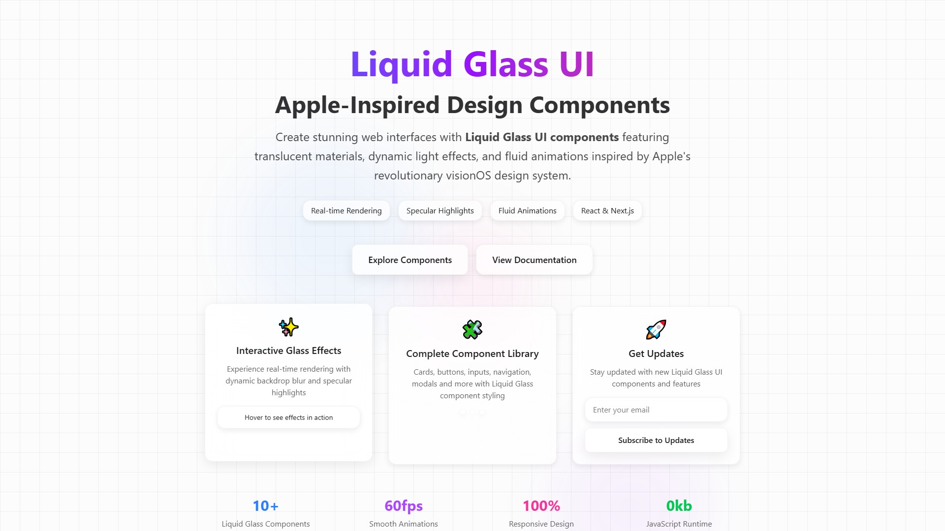 Liquid Glass UI是一个受Apple visionOS设计系统启发的React组件库,提供以下核心功能: