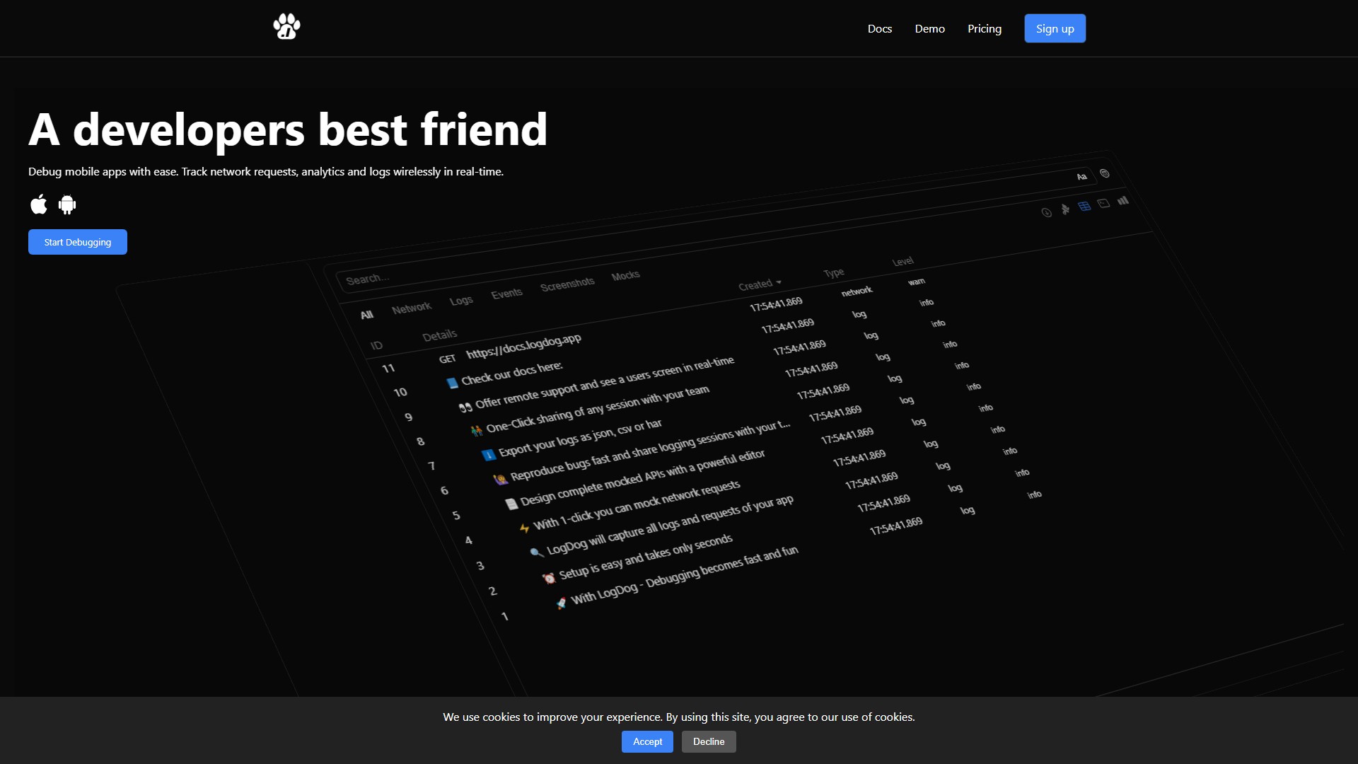 SDK集成: 在应用中集成LogDog SDK(3分钟) swift import LogDog LogDog.initialize() let config = LogDogConfig(apiKey: "YOUR_API_KEY", logs: true, network: true, events: true) LogDog.start(config: config) LogDog.i("Hello from LogDog!")