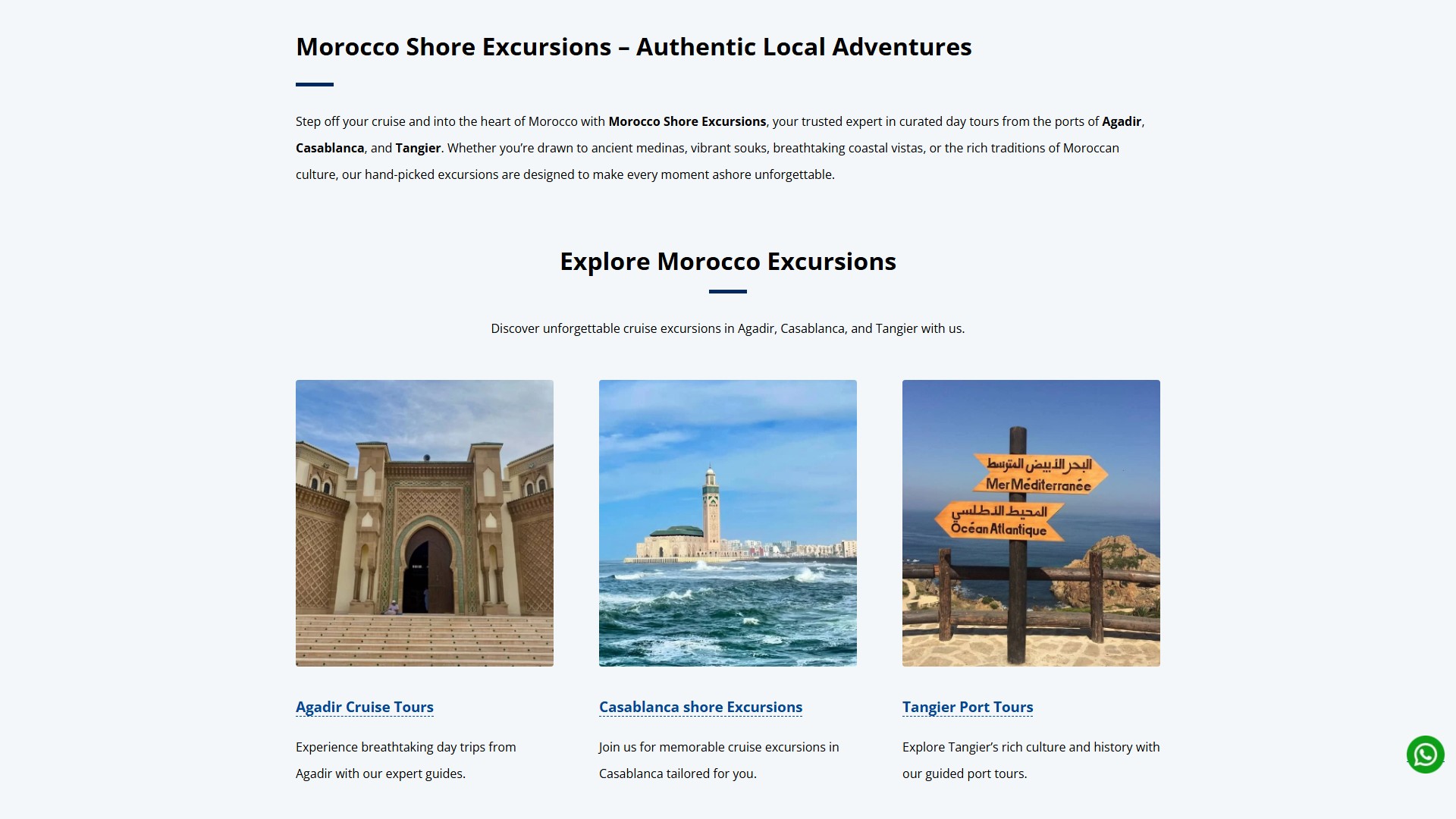 提供从摩洛哥三个主要港口(阿加迪尔、卡萨布兰卡、丹吉尔)出发的岸上观光服务