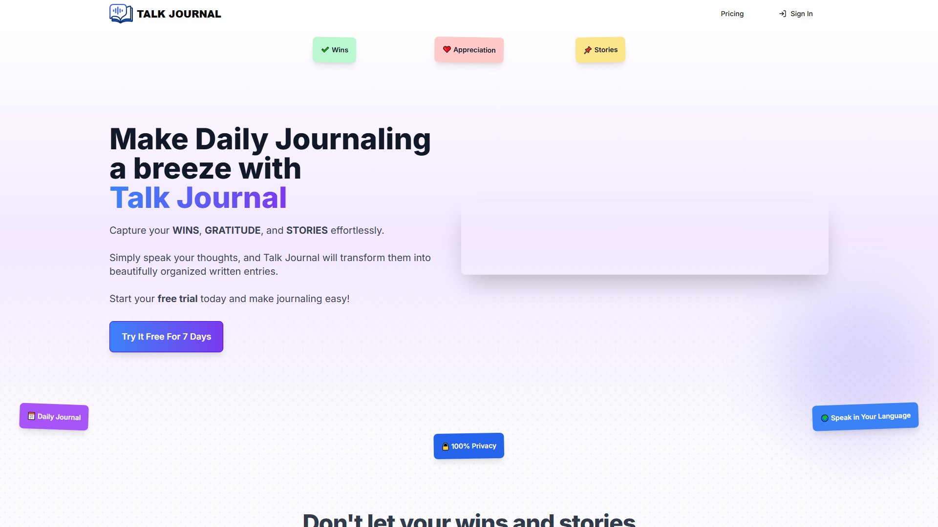 用户在一天中的任何时间,通过语音记录自己的想法、成就或故事。Talk Journal 自动处理语音,将其转换、分类并储存为日记条目。