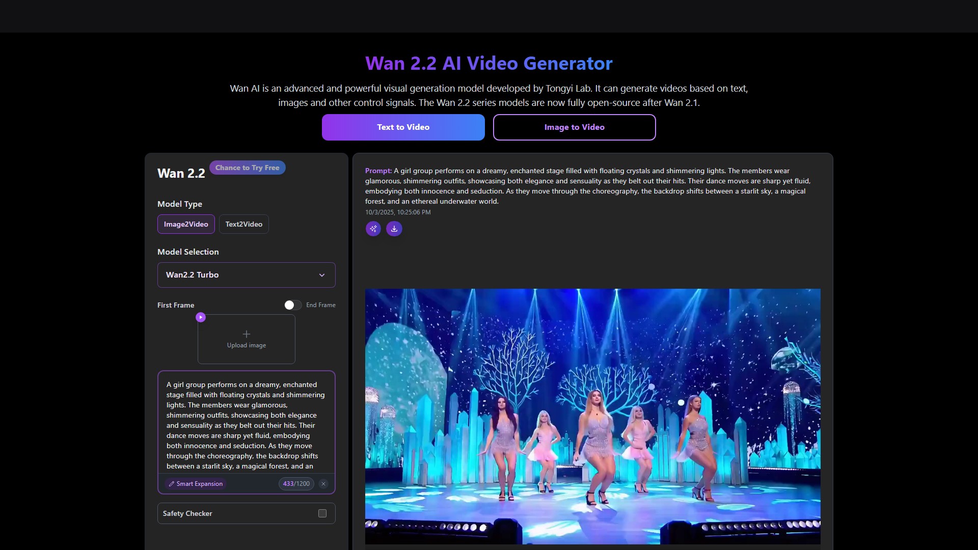 用户可以通过网页界面输入文本描述或上传图像来生成视频,支持智能扩展和安全检查功能。生成一个5秒480P视频需要130 credits,在RTX 4090上约需4分钟。