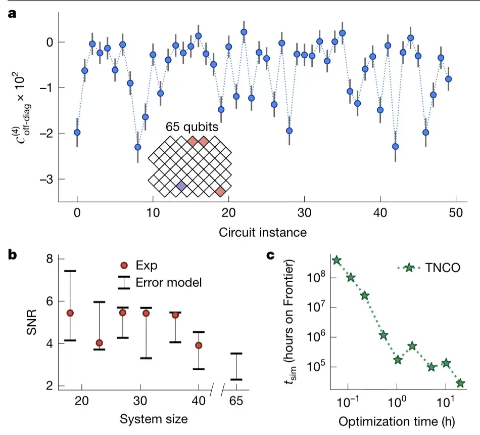 研究团队用超导量子处理器(最多用到 65 个量子比特)做了两类关键实验,得出两个核心结论:
