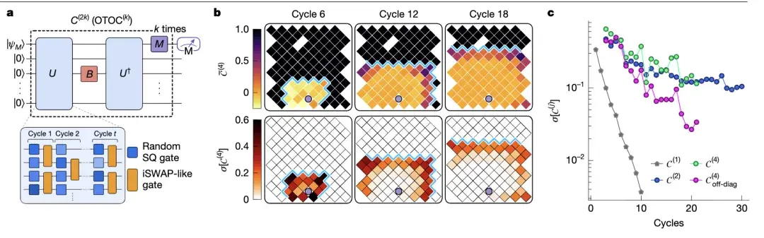 传统的TOC信号,演化9个周期后就弱到几乎测不到(标准差<0.01);但测的OTOC(尤其是二阶 OTOC,记为 OTOC⁽²⁾),就算演化20个周期,信号依然清晰(标准差>0.01)。