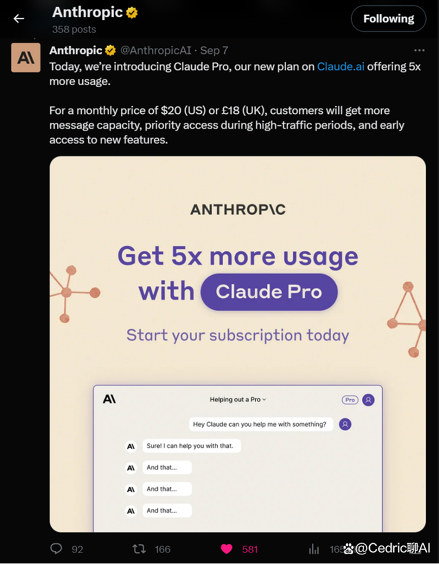 通过每月支付20美元(美国)或18英镑(英国)后,你将获得Claude Pro服务。相较于免费版,Pro版主要提供以下增值服务: