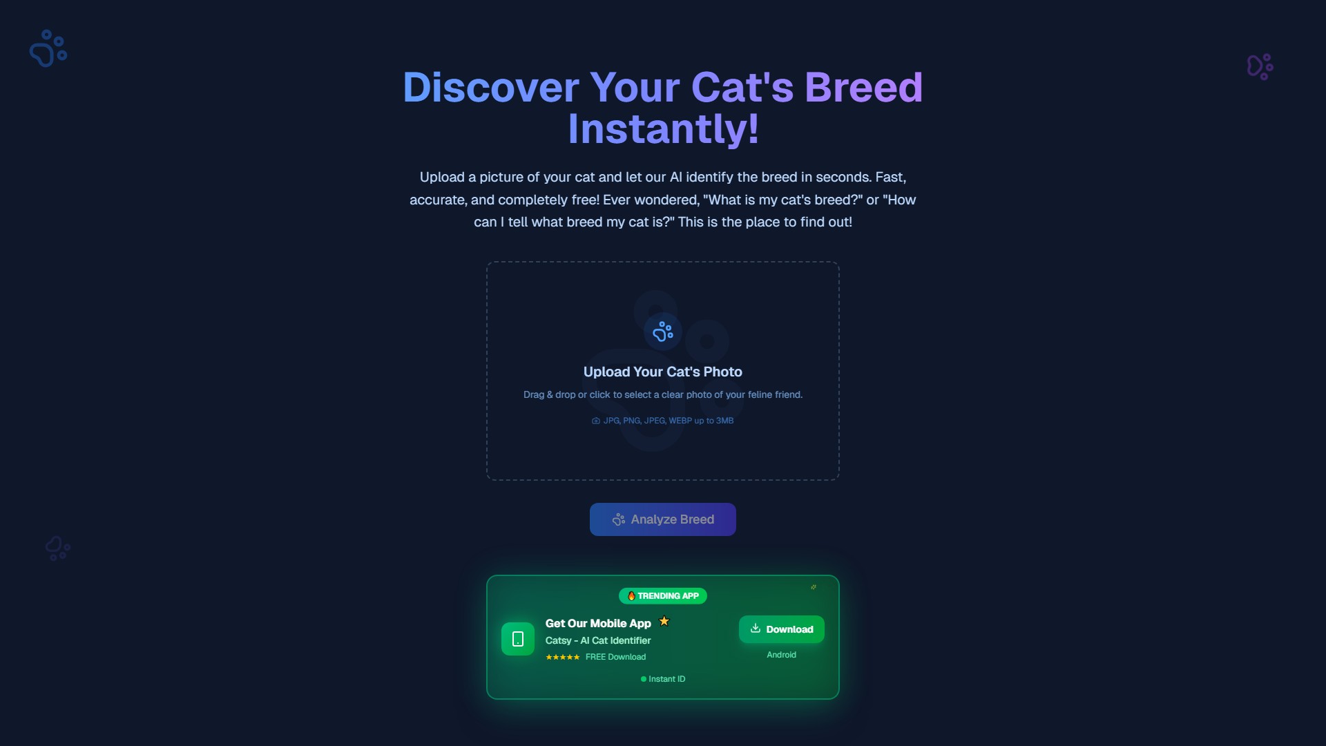 AI Breed Identification: Upload a cat's photo, and the advanced AI analyzes its unique features to instantly identify the breed.